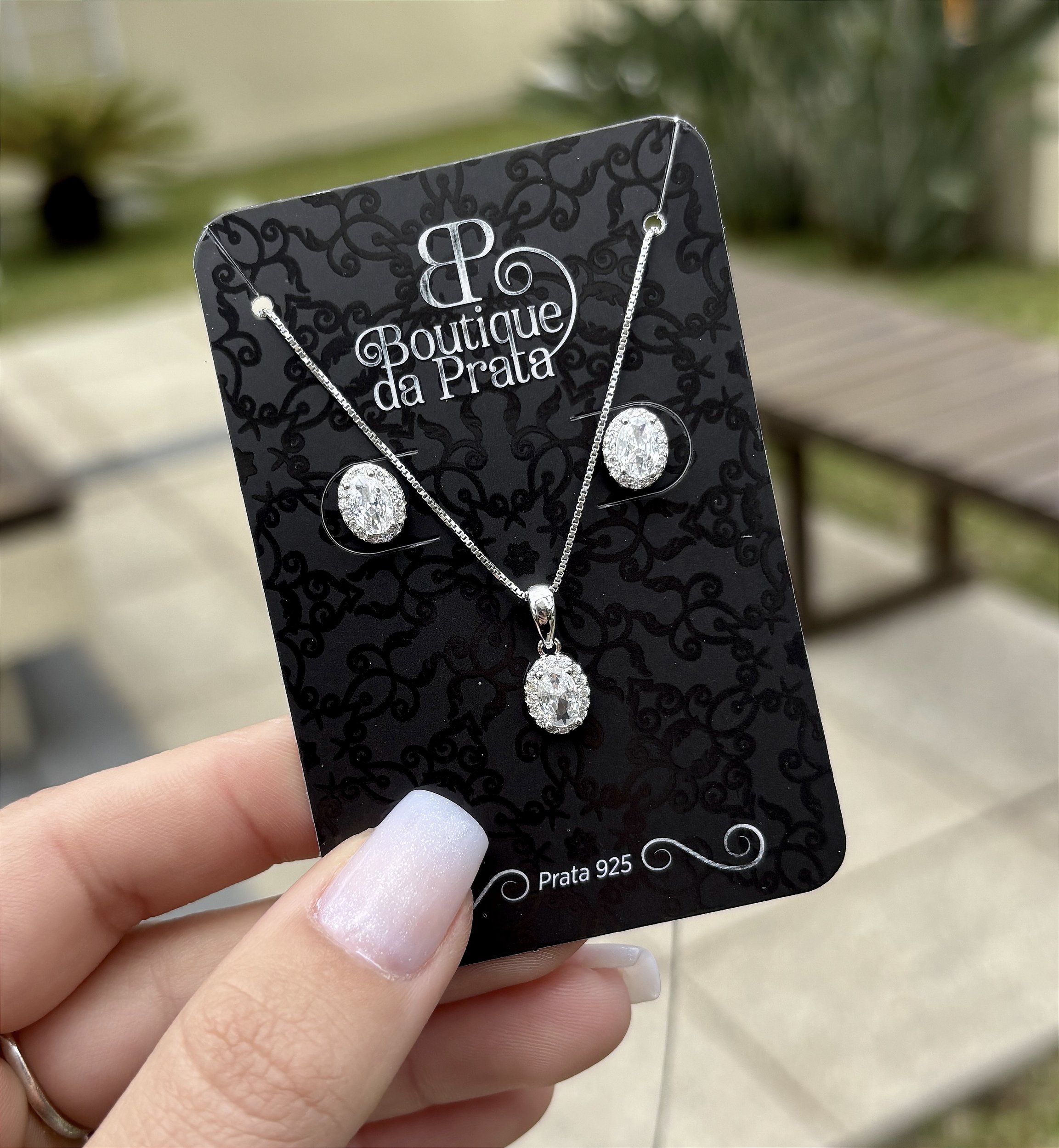 Esse lindo conjunto é composto por colarzinho de 45cm e brincos com pedra oval cravejada em zircônias, que refletem a luz com elegância e destacam qualquer look.