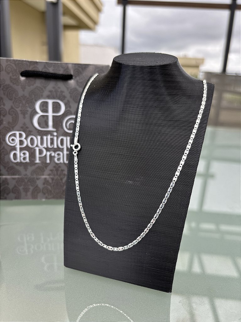 Produzida em Prata 925 legítima, a corrente modelo Piastrine possui elos retangulares que refletem a luz de forma sofisticada, trazendo um toque moderno e atemporal.